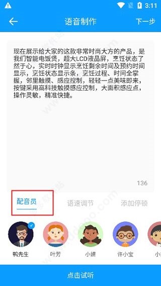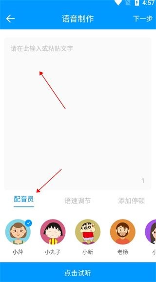 2、进入语音制作页面,粘贴准备好的文字,选择合适的配音员进行试听,然后点击下一步。