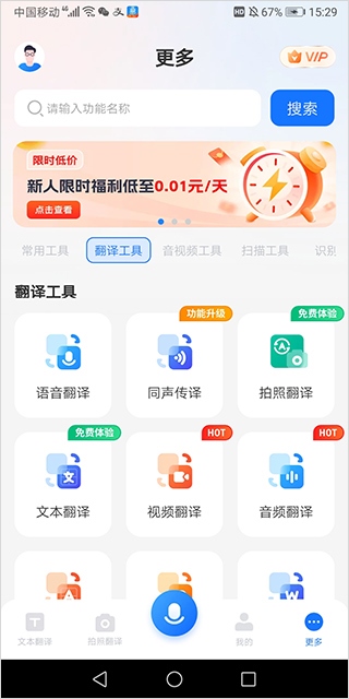点击首页底部的麦克风图标,即可进行语音翻译,具体使用方法请参考前文。