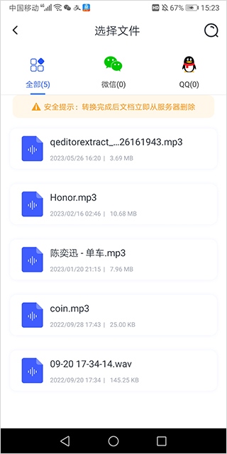 3、上传手机中的音频文件,或者来自微信、QQ的音频文件即可。