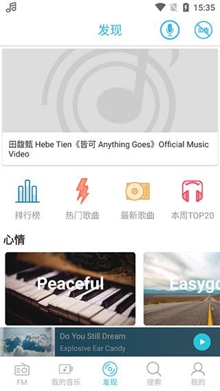 1、打开app后默认进入电台界面,您可以在这里聆听不同类型的电台音乐,切换到【发现】页面,选择您喜欢的歌曲。