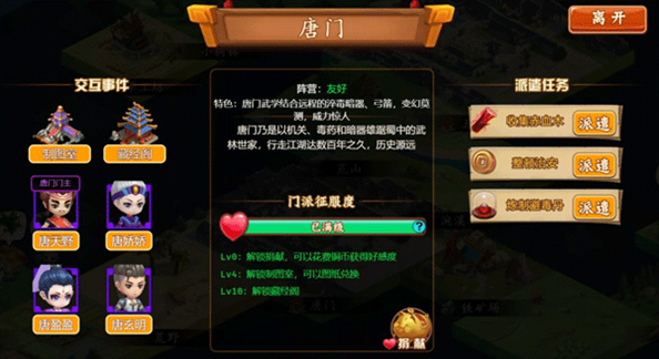 唐门:收集赤血木(3次/天)、整顿治安、炼制避毒丹(3次/天)